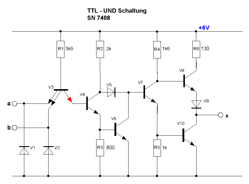 V8 beträgt die Spannung von V7 ca. 3,7V. Zum Ausgang x beträgt die Spannung