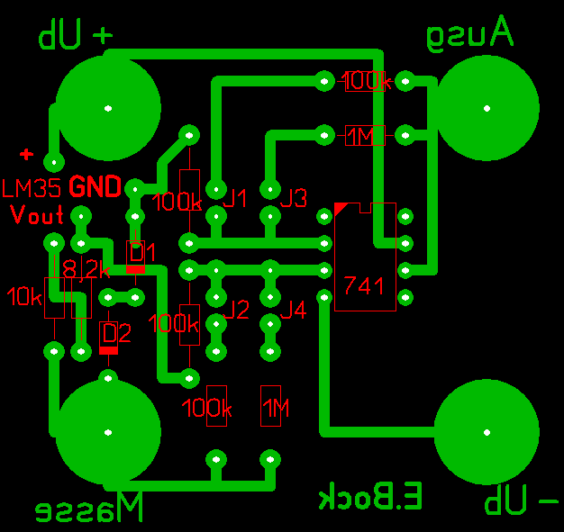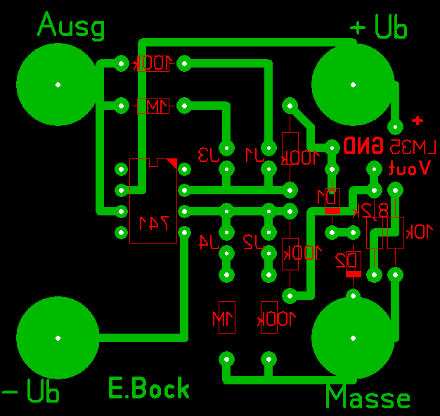 Layout zu Schaltung 1. Auf die Kupferseite gesehen. ( Horizontal gespiegelt.)