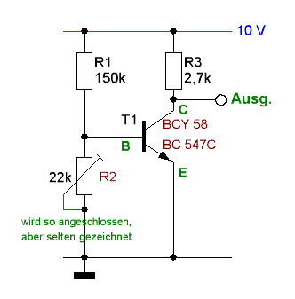Empirische Ermittlung von Widerstandswerten: 1. Annahme es handelt sich um einen Kleinsignal-Transistor mit ca. 200 facher Spannungsverstärkung. 2. Die Schnellform der Widerstandsauslegung soll weniger als 1 Minute betragen. |
