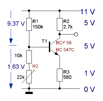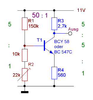 Spannung von 1 Volt angenommen. Arbeitsstrom z.B.: max. 2 mA. >500 Ohm Die Arbeitsstromkreis sind die Widerstandswerte im Verhältnis der gewünschten Spannungen anzunehmen. R4 gewählt mit 560 Ohm. = 1 1:5:5 Die Steuerstromstrecke R1 + der zusammengefasste Widerstand R2 ergeben ebenfalls ein Widerstandsverhältnis von 1 : 5 Das Verhältnis Steuerstrom zu Arbeitsstrom beträgt 1: 50 |