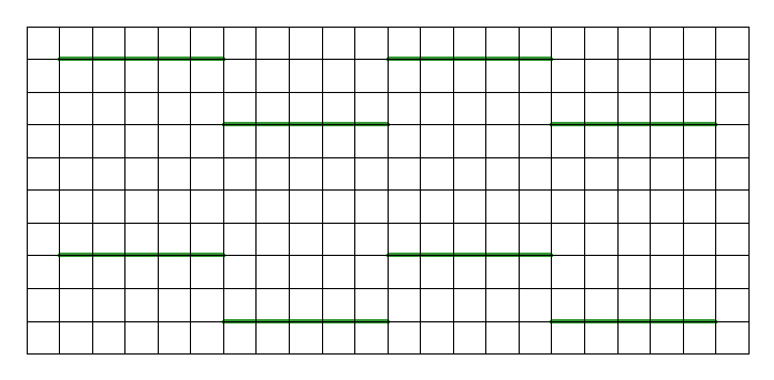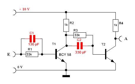 Jeder Inverter (z.B. T1) dreht das Signal um 180° in der Phasenlage. Zusätzlich verstärkt er die Spannung und den Strom. Die Kondensatoren (Beschleunigungskondensatoren) übertragen die Flanken des Signals während die Widerstände den Gleichspannungsanteil übertragen. Ohne die Beschleunigungskondensatoren wären die sichtbaren Signale im Oscilloscope unkenntlich, aber mit diesen ist es wie die Abbildung links. |