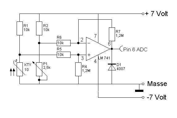 Temperatursignal wird zu erst durch den KTY 10 auf die Spannung aufmoduliert. Es
