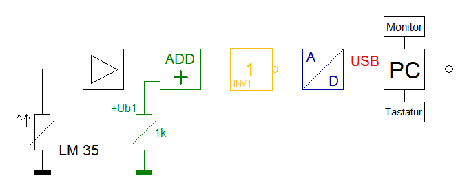 Meine Idee ist es eine Temperaturschwankung in ein Spannungssignal umzuwandeln und dieses Spannungssignal digital (8Bit) auszugeben. Dieses Signal sollte dann vom Computer weiter verarbeitet werden. Kurz gesagt: Ein Thermometer, dass man an den PC anschließen kann.