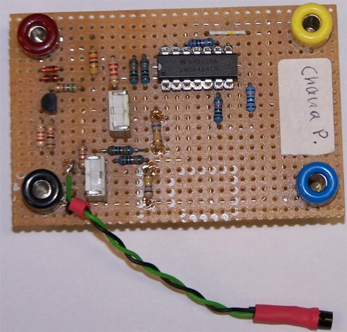 Wir suchen die Platine nach eventuellen Fehlern durch. Dabei achten wir auf Leiterbahnen die Kurzschlüsse bilden können, auf die Pins des OP's die man leicht verwechseln kann und auf die Größe der Widerstände. Das Zählen der Bauteile und das Vergleichen mit dem Bestückungsplan sollte ebenfalls durchgeführt werden. Kalte Lötstellen sollten behoben und Lötnasen vermieden werden. Nach der Fehlersuche beginnen wir mit der Prüfphase. Hierbei schließen wir die Platine ohne EC an. Kritisch beobachten wir die Messgeräte nach eventuellen Kurzschlüssen. Mit Messspitzen tasten wir uns durch die Leitungen und überprüfen Teilspannungen und Strom. Am OP-Steckplatz prüfen wir Pin 4 und Pin 11 nach Spannung. Wenn diese richtig sind sollten bei Pin 4 eine Spannung von +5V haben und bei 11 -5V.