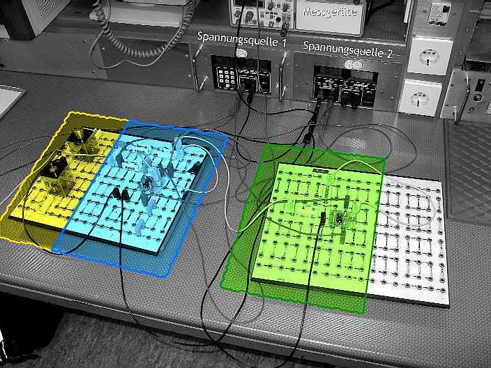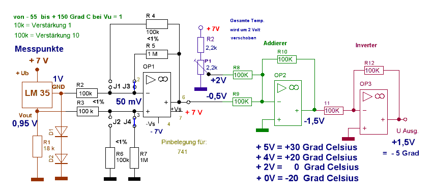 Bereich gelb: Das erste Potentiometer simuliert die komplette Eingansstufe der Platine; das zweite den Temperatursensor. Bereiche blau und grün entsprechen, denen der Platine und übernehmen gleich Aufgaben. Bereich blau zeigt den Addierer, Bereich grün den Inverter. Ergebnis: Es liegen kein Konstruktionsfehler vor, der „Nachbau“ funktioniert in allen Bereichen.