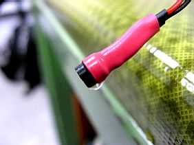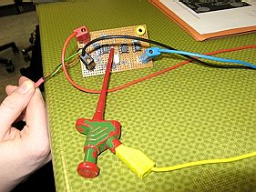Nachdem die Schaltung (Platine) nun erwartungsgemäß funktioniert, kann auch ihr Verhalten auf unterschiedliche Temperaturen getestet werden. Diese werden durch Körperwärme (Anfassen des Temperatursensors) und Verdunstungskälte (Wassertropfen an Temperatursensor) simuliert.