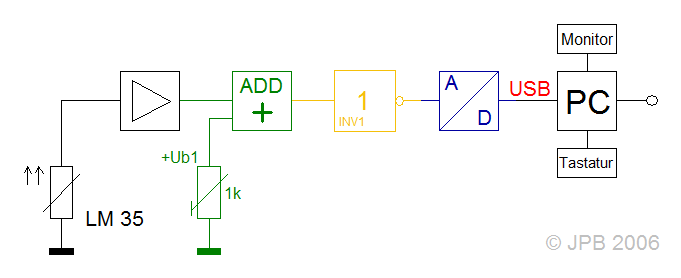 Ganz links ist der Temperatursensor namens LM 35 in schwarz eingezeichnet. Er ist mit einem Verstärker verbunden und liegt an Masse an. Daneben ist in grün ein einstellbarer Widerstand, der wiederum an Masse anliegt abgebildet. Ein Addierer, der beide Signale addiert und damit das Temperatursignal erhöht. Dies ist notwenig, weil der Analog-Digital-Wandler dieser Schaltung nur positive Spannungen verarbeiten kann. Die positive Betriebspannung wird hier +Ub genannt. Danach kommen ein Inverter, hier gelb, der positiv in negativ umgekehrt und in blau ein Analog-Digital-Wandler, der das bisher analoge in ein digitales Signal umwandelt. Dabei bezeichnet seine Bit-Angabe die Anzahl seiner Ausgänge (8 Bit = 8 Ausgänge). Das nun digitalisierte Signal wird per USB an einen PC, hier schwarz, übertragen. Exemplarisch sind auch Tastatur zur Eingabe und Monitor zur Ausgabe eingezeichnet. Ganz rechts ist noch die Stromversorgung, die sowohl PC als auch Schaltung versorgt, abgebildet.