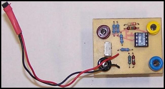 Der schwarze Kasten ist das IC, der weiße Kasten ist das Potentiometer. An den Kabeln hängt der Wärmewiderstand in einigem Abstand zur Platine. |