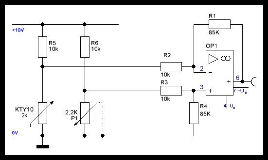 einem KTY81 am 2. Pin (1. Eingang) und einem Potentiometer am 3. Pin (2.