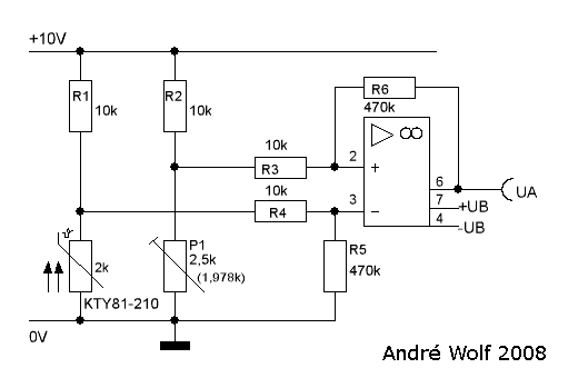 Die Widerstände R1, R2, das Poti P1 und der KTY 81-210 dienen jeweils als Spannungsteiler für die beiden Eingänge des OP’s. Wenn sich die Temperatur ändert, wird der Widerstand des KTY 81-210 größer oder kleiner und die Spannung am Pin 3 entgegengesetzt zum Widerstand des KTY 81-210 größer oder kleiner. Mit dem Poti P1 wird die Spannung am zweiten Eingang geregelt. Das Verhältnis zwischen R7/R6 und R4/R5 bestimmt den Verstärkungsfaktor.