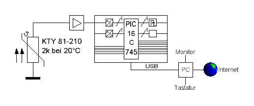 Meine Idee ist es eine Temperaturschwankung in ein Spannungssignal umzuwandeln und dieses Spannungssignal digital (8Bit) auszugeben. Dieses Signal sollte dann vom Computer weiter verarbeitet werden. Kurz gesagt: Ein Thermometer, dass man an den PC anschließen kann.