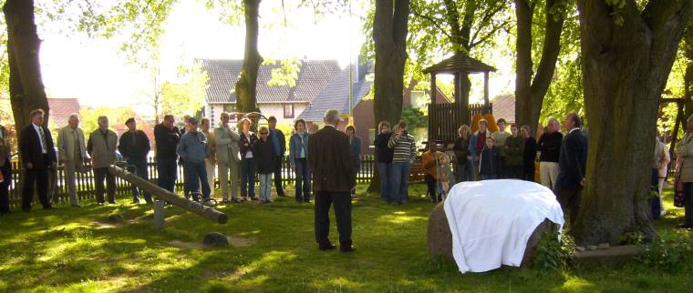 62 TeilnehmerInnen waren zur Enthüllung zusammengekommen. Norbert Löhr als Kreistagsmitglied, Ernst August Bode als stellvertretender Samtgmeindebürgermeister, Bürgermeister Heinz Heusmann, die Ratsherrn Klaus-Peter Himstedt und Thomas Quoß waren Vereinsvorsitzende und Vertreter von Institutionen und zahlreiche Bürger und Bürgerinnen versammelt.