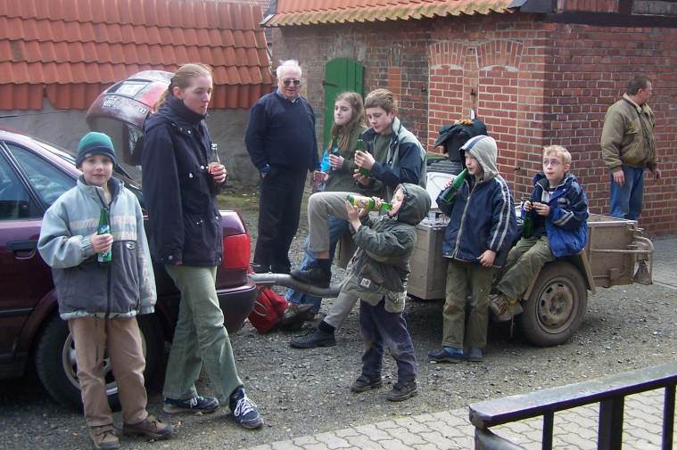 von links nach rechts: 1. Bertram Lütkopf, 2. Ortrun Lütkopf, 3. Siegfried Royer, 4. Irmhild Lütkopf, 5. Arnulf Lütkopf, 6. Lutz Bünger, 7. Emil Bünger, 8. Heiner Bünger jun., 9. Dieter Prönnecke. Ohne Abbildung Wiltrud Lütkopf und drei weitere Erwachsene. Während 2002 noch 20 Sack Müll pro Sammlung anfielen, ging dies kontinuierlich auf 6 Sack zurück, die in knapp 2 Stunden aufgesammelt waren. Unter dem Weggeworfenen befanden sich kaum noch Pfandflaschen, -Dosen und -Plastikflaschen. Es wurden auch keine Reifen, Batterien, Fernseher gefunden. |
