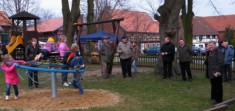 Um 15 Uhr wurde das Spielgerät "Pilzkreisel" offiziell durch Eike Bock, den Bürgermeister Heinz Heusmann, den Ortvertrauensmann Norbert Löhr und den Samtgemeinde-Bürgermeister Jens Range als neuen Anziehungspunkt für Kinder der Öffentlichkeit übergeben. Es haben über 40 Bereler Kuchenspenderinnen, die Junggesellschaft Berel mit Mark Brosinski, die Feuerwehr Berel, das Team um Klaus Mallas, Sandra Bock durch den Kinder- und Babybasar 2008 der Bürgerverein Berel e.V. und 2009 und als größte Einzelspender Jörg und Ingrid Siebenhaar dieses Spielgerät finanziert. Insgesamt waren über 200 Bereler daran beteiligt. SZ 10.12.2009 |
