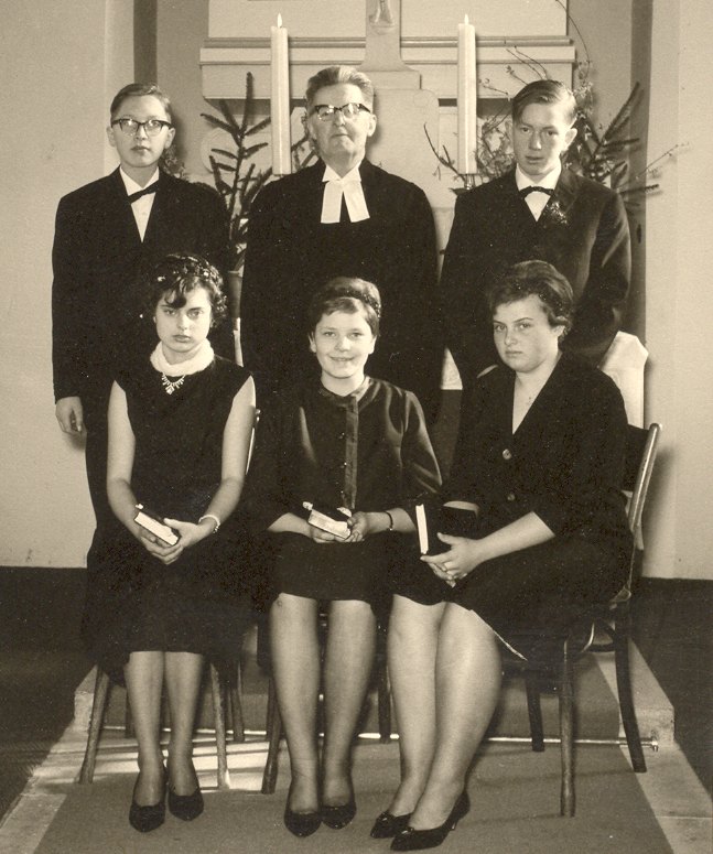 von links nach rechts: Eike Bock, Pastor Caspar, Willi Prönnecke, Monika Peck, Edeltraud Haars verh. Gerbershagen, Inge Elsmann verh. Rakownik.